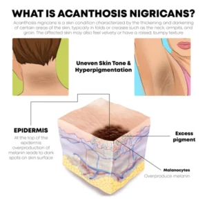 آکانتوز نیگریکانس نام لکه های خشک و تیره پوست است که معمولاً در زیر بغل، گردن یا کشاله ران ظاهر می شوند. آکانتوز نیگریکانس وضعیتی است که باعث ایجاد نواحی پوست مخملی تیره و ضخیم در چین و چروک های بدن می شود. معمولاً زیر بغل، کشاله ران و گردن را درگیر می کند. آکانتوز نیگریکانس تمایل دارد افراد چاق را تحت تاثیر قرار دهد. به ندرت، وضعیت پوست می تواند نشانه سرطان در اندام داخلی مانند معده یا کبد باشد. درمان علت آکانتوز نیگریکانس ممکن است رنگ و بافت معمول پوست را بازیابی کند. آکانتوز نیگریکانس با رشد بیش از حد پاپیلوماتوز مخملی اپیدرم مشخص می شود.
