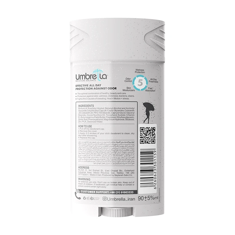 بافت کرمی و نرم آن بهسرعت جذب پوست میشود و هیچ لکهای روی لباس باقی نمیگذارد. این محصول با ترکیب خاص خود تا 97٪ از ایجاد بوی ناخوشایند بدن جلوگیری کرده و تا 48 ساعت ماندگاری فعال دارد. ترکیبات آنتیباکتریال و مرطوبکننده در فرمول استیک آمبرلا باعث نرم شدن پوست زیر بغل و پیشگیری از خشکی و تحریک میشود.